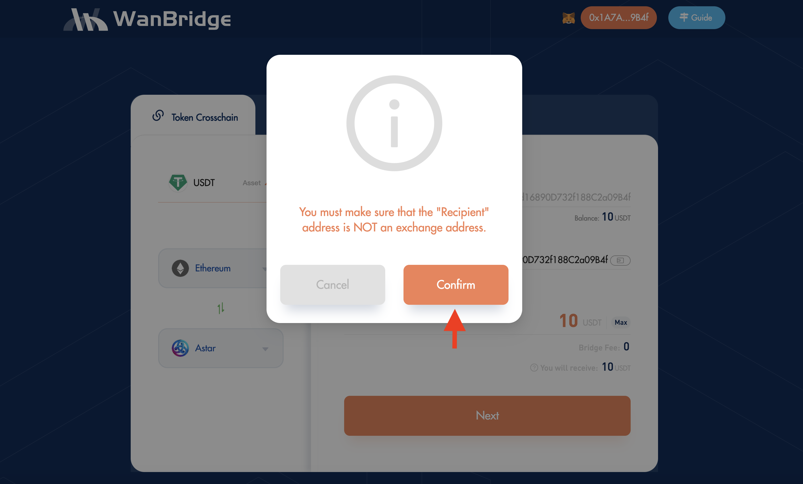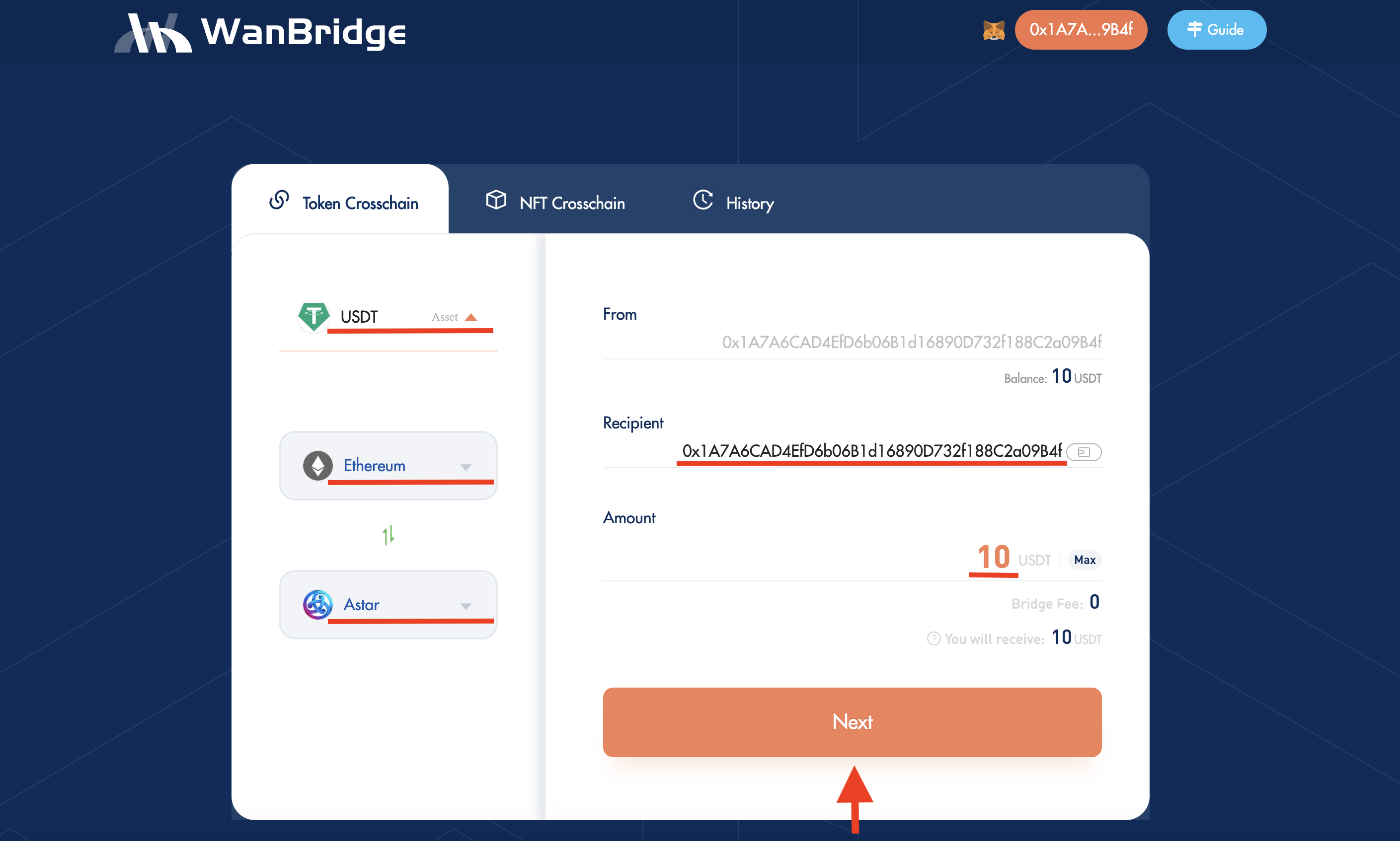 Select “USDT” from the drop-down menu. Choose “Ethereum” and “Astar” as your From and To networks respectively. Finally, input your destination address in the Recipient field as well as the amount of $USDT you want to send. Click Next.
