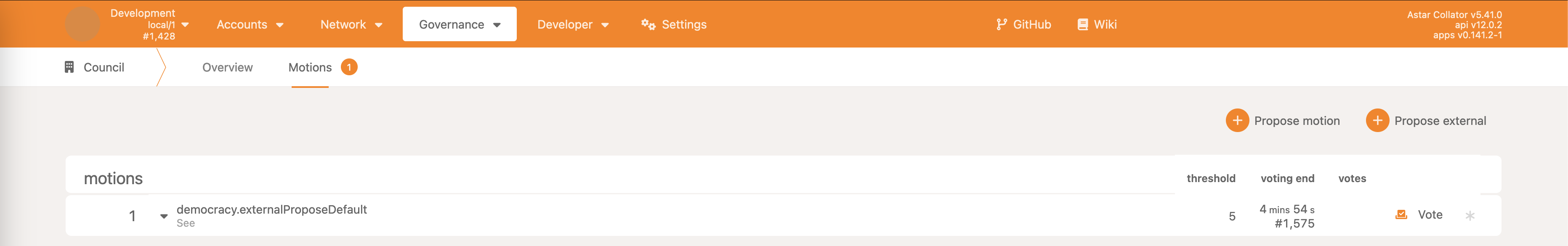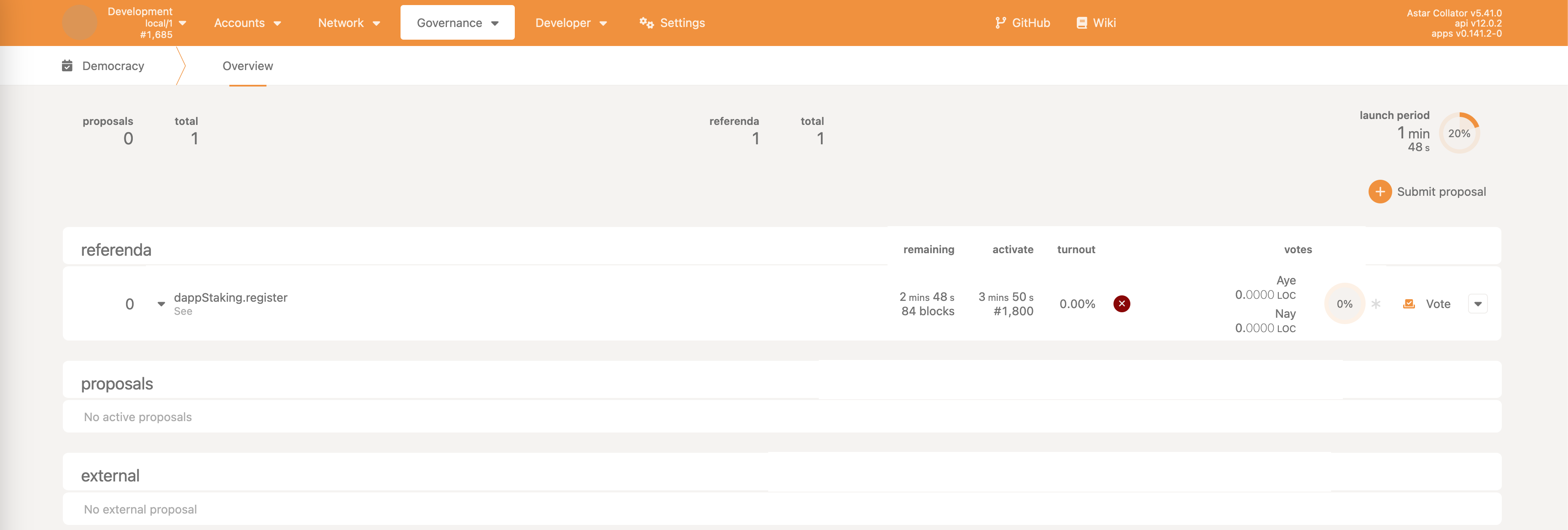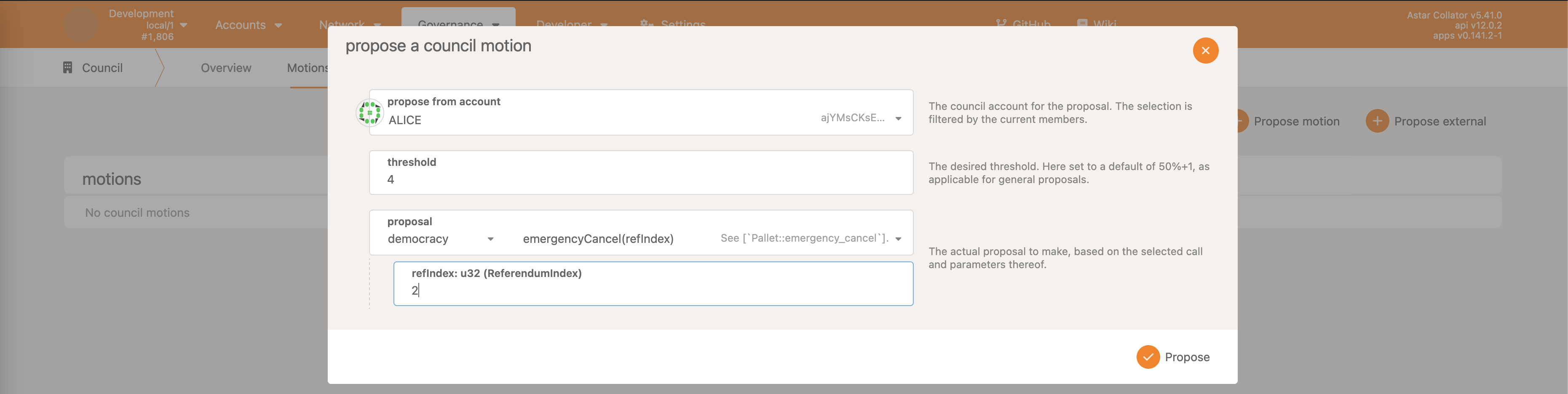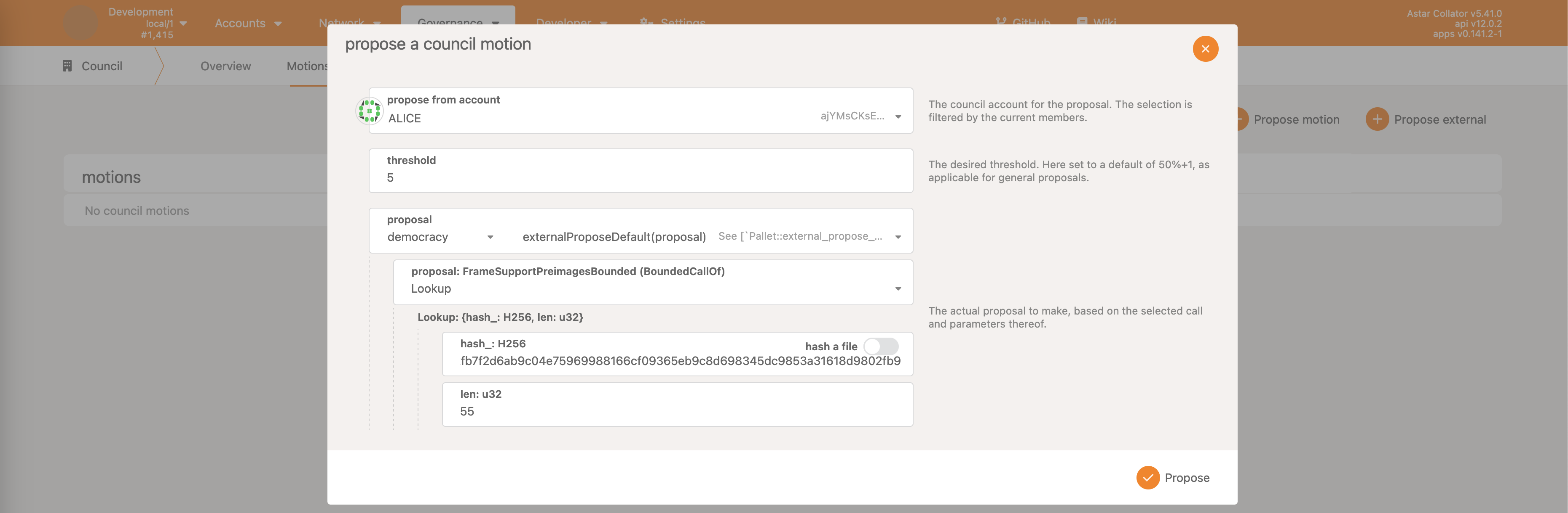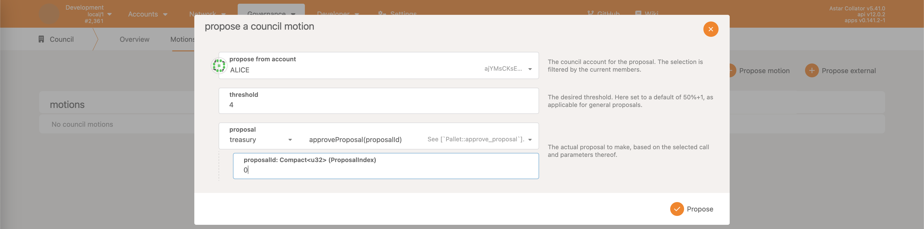 • Democracy->propose - make a proposal, reserving some ASTR as the deposit