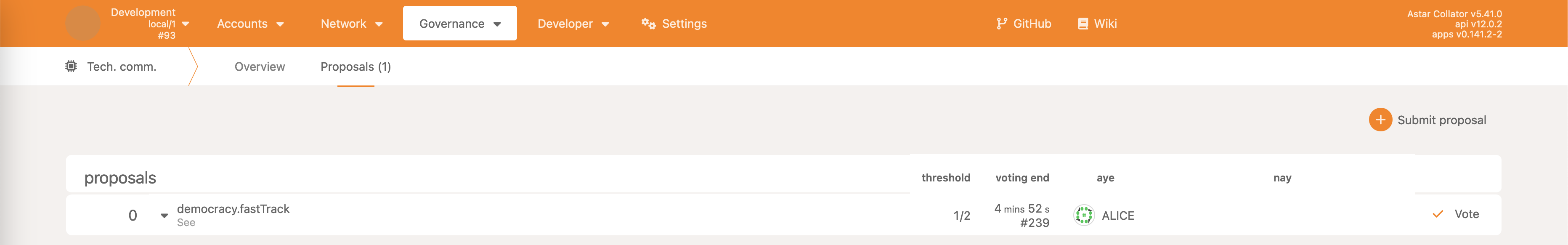 Once the Fast track action is complete, a new motion under the Governance -> Tech. Committee -> Proposals tab is created.