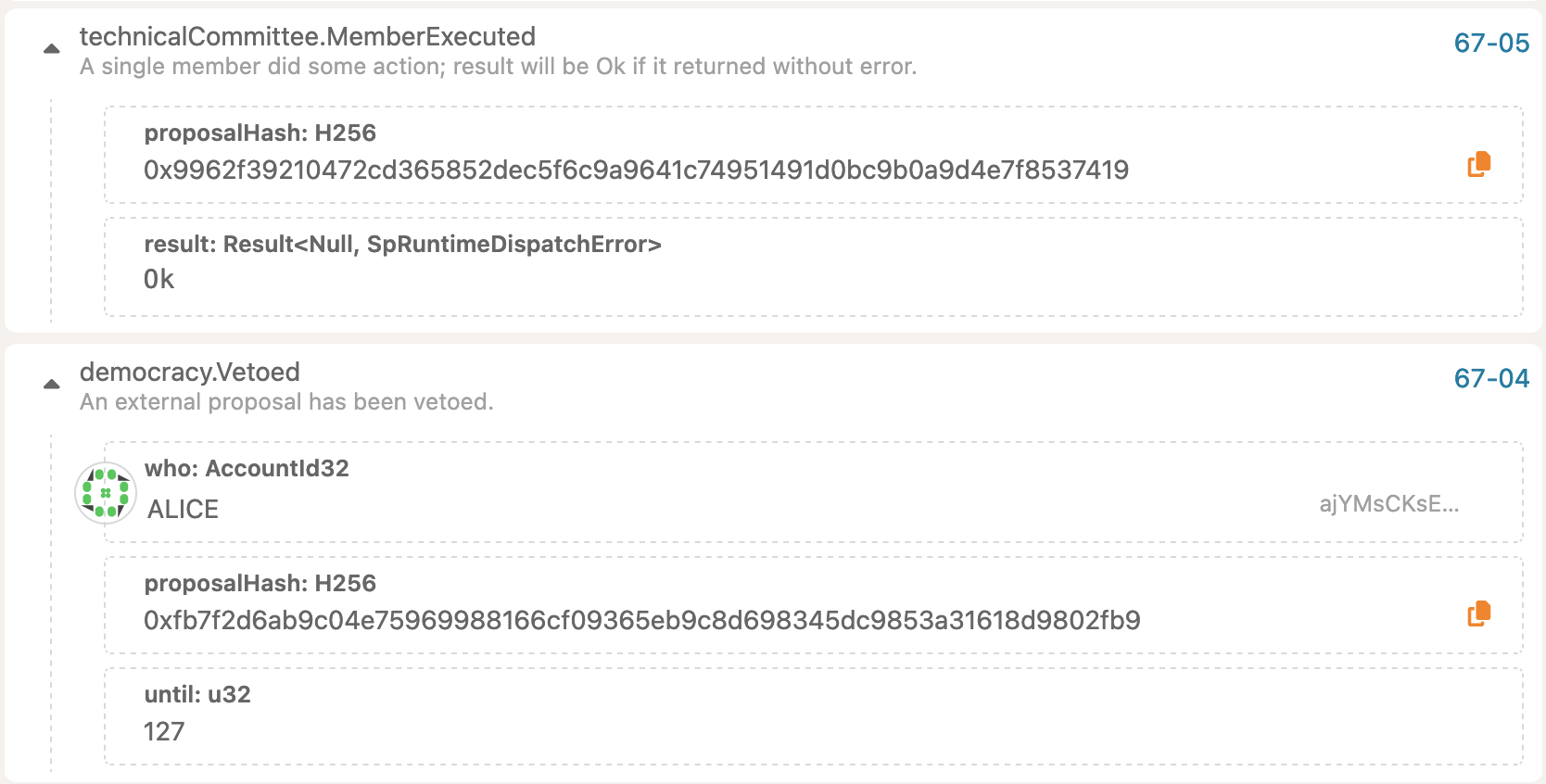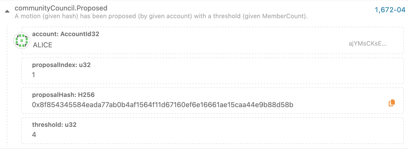 Once the proposal call is executed, user can observe the proposalHash and index. This can be used to vote & close the proposal as described in the first chapter.
