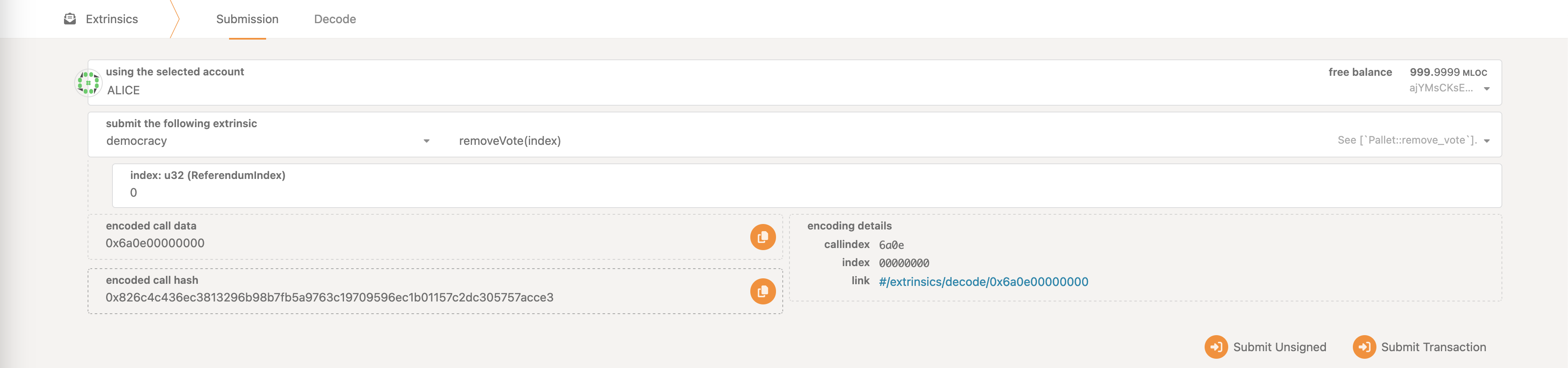 • Democracy->removeVote - removes the vote from the referendum, releasing the funds if no locks are applicable anymore