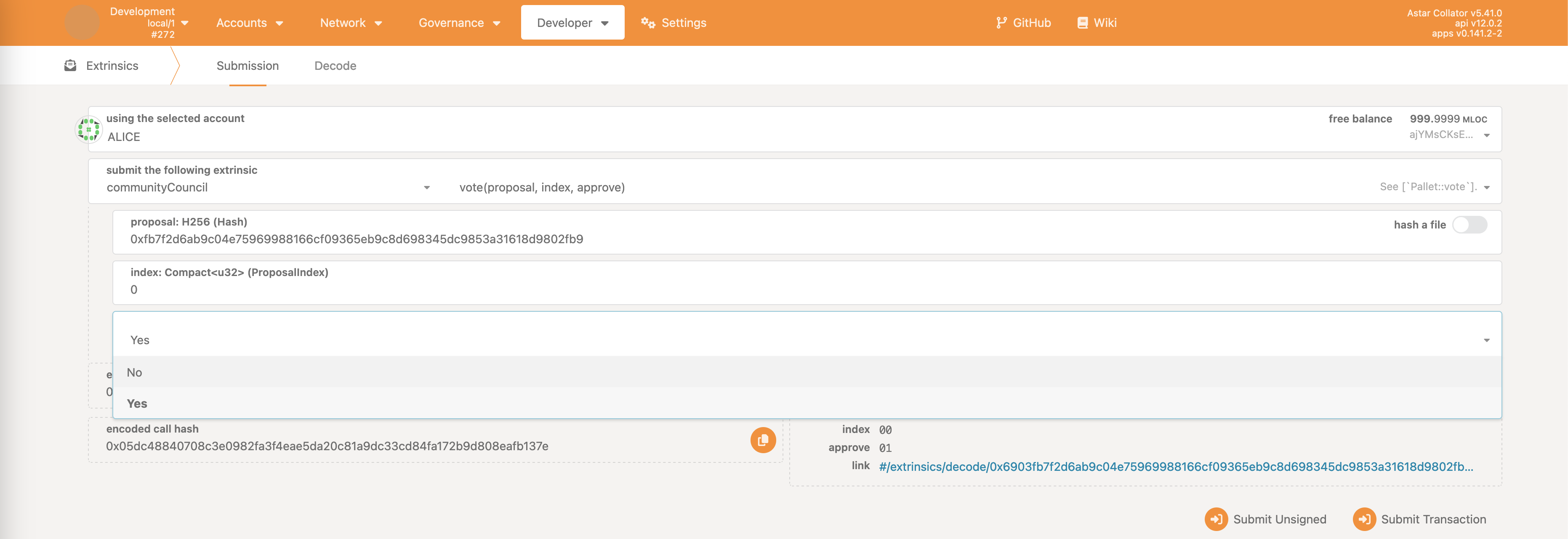 • need to specify both the proposal hash and the proposal index as emitted by the propose call