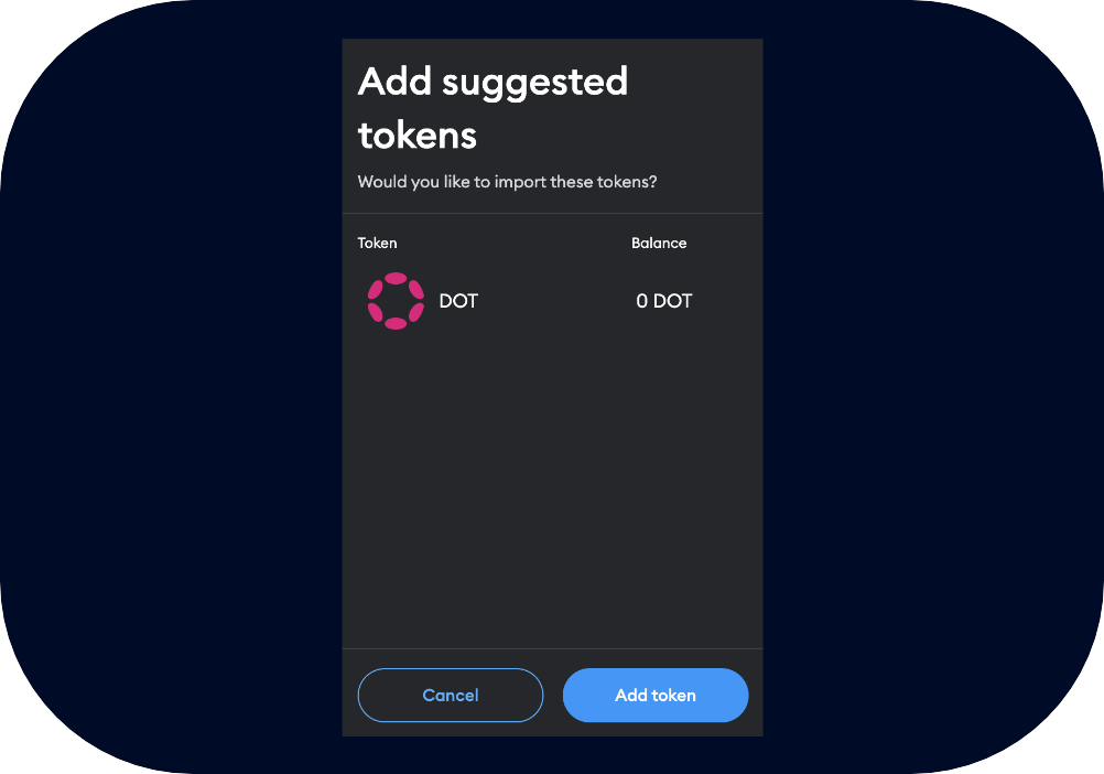After the account is connected, you will be able to import tokens into the wallet. Click on Add to wallet button in DOT row.