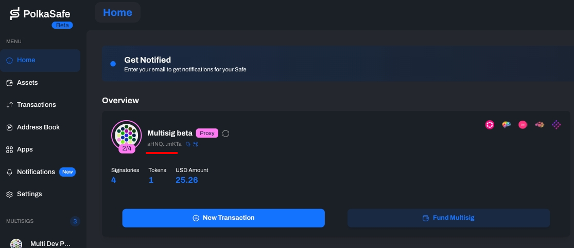- Create Backups: Establish a backup of the multisig account, facilitating seamless asset transfers. In other words, all assets will be in the proxy account. This means that when you add or remove any signatory, the multisig address will change, but the proxy address will not. Therefore, assets in the proxy account won't be lost.