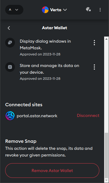 In MetaMask, click on the tripple dot icon on the top right of the extention, then Snap, lastly click on Astar Wallet, scroll to the bottom and click Remove Astar Wallet