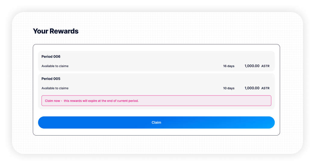 Here you can see how many tokens you have earned for past periods and what you still have to claim;