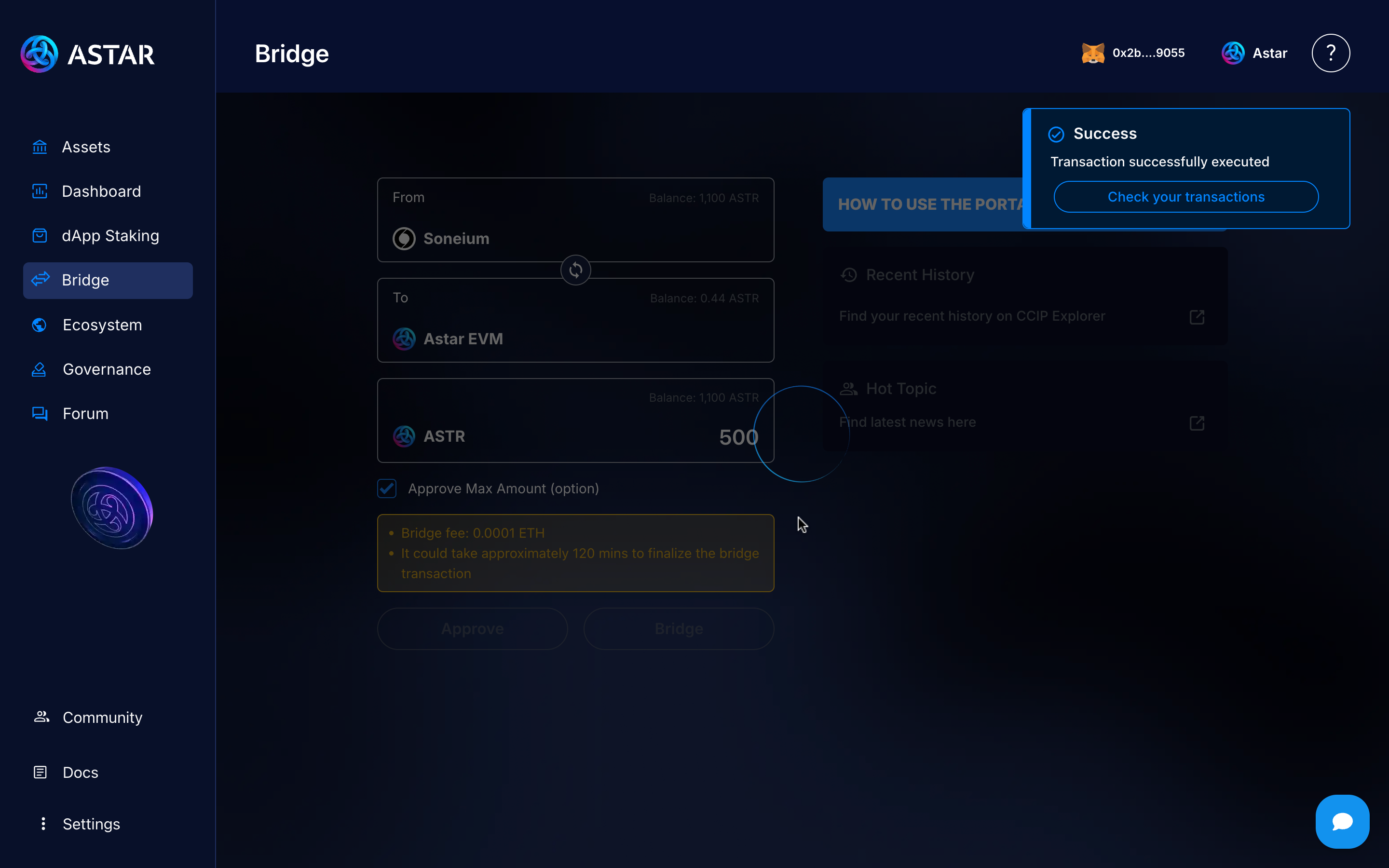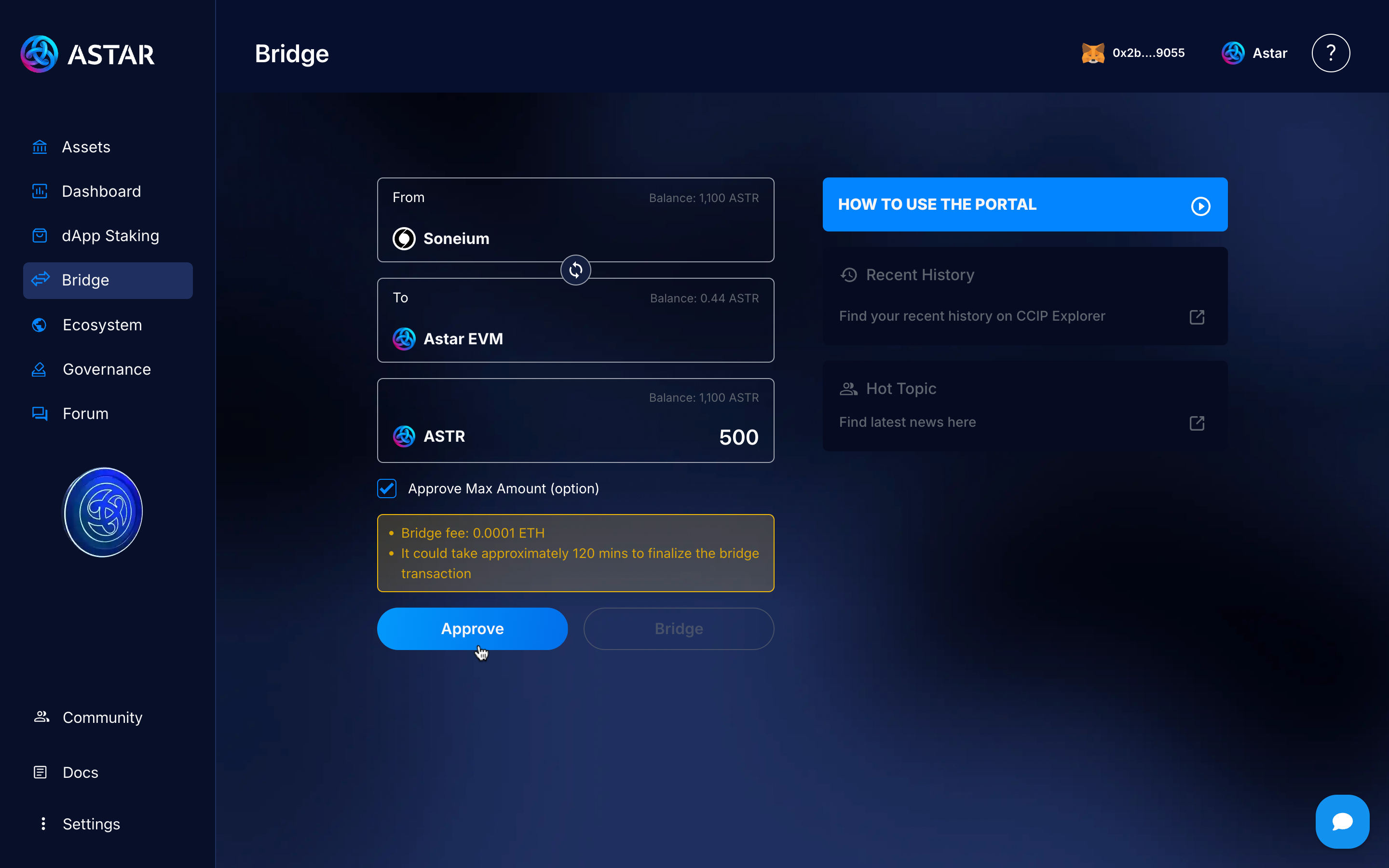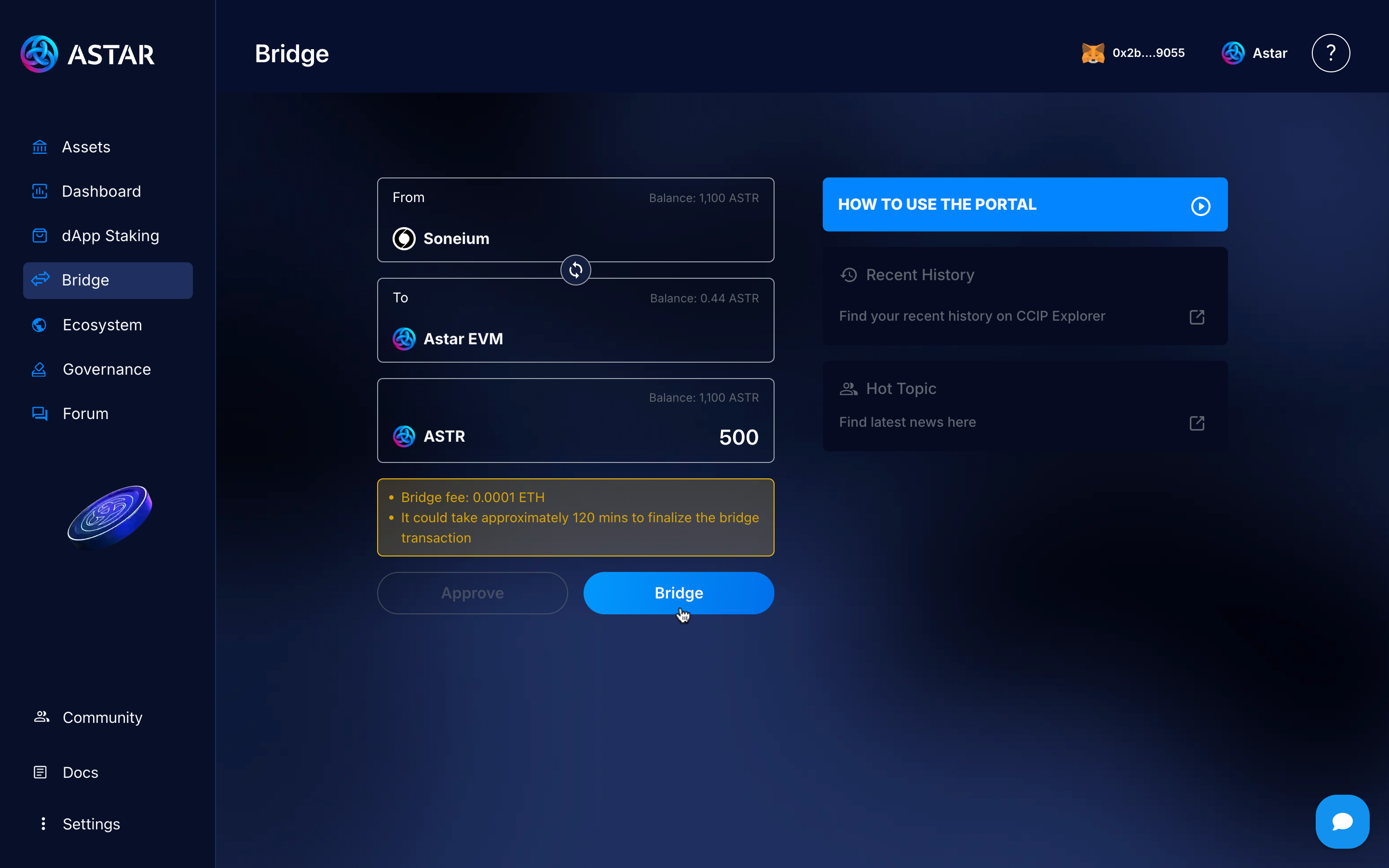 Once you’ve signed the Approve transaction, the Bridge button will be enabled, allowing you to send your ASTR tokens from Soneium to Astar EVM.