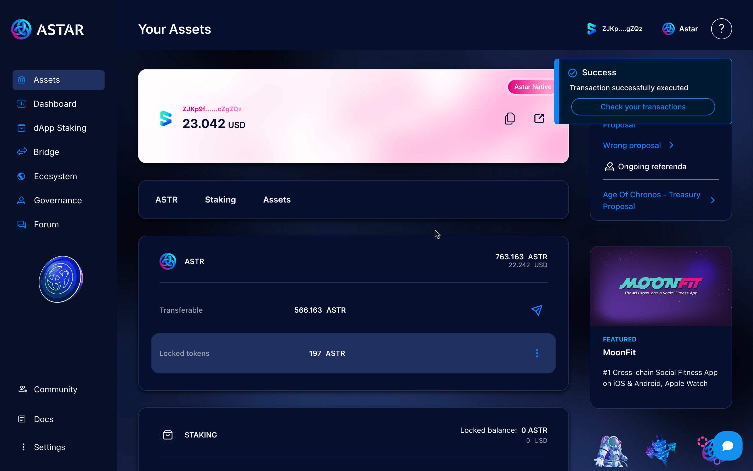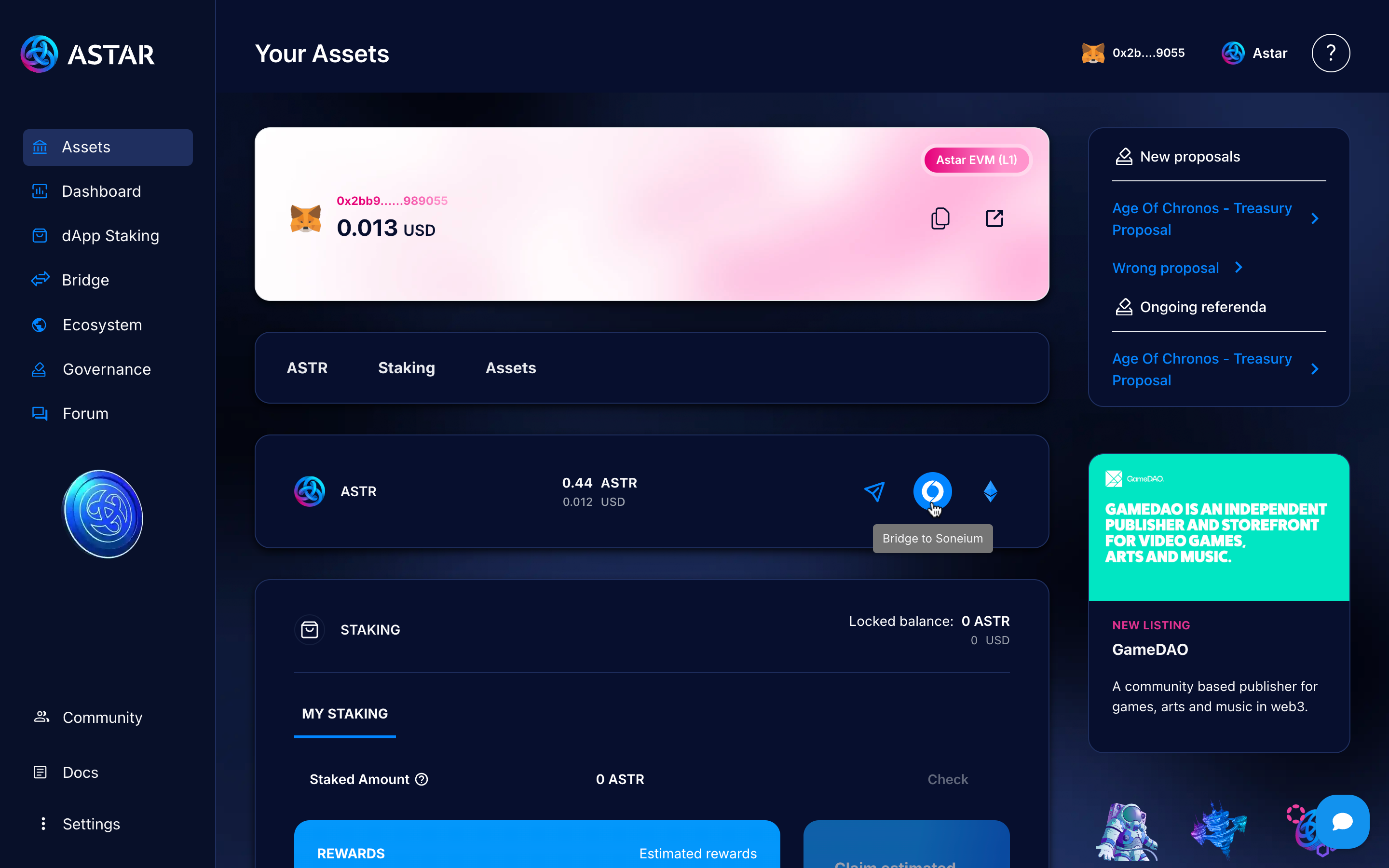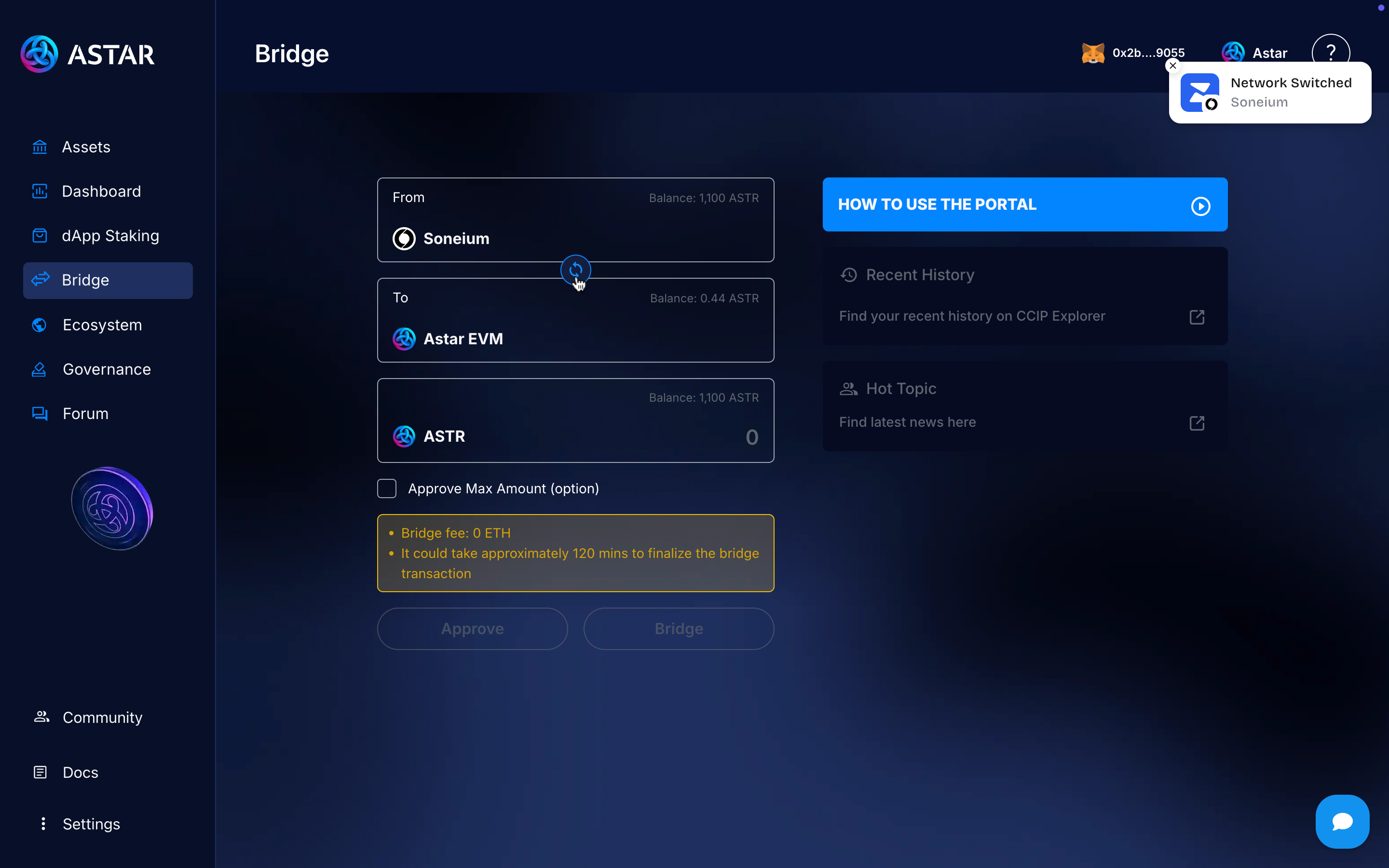 You’ll now see your updated balance on the Astar EVM network instead of Soneium. Congratulations, you’ve successfully completed the first part of the bridge!